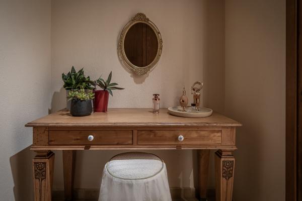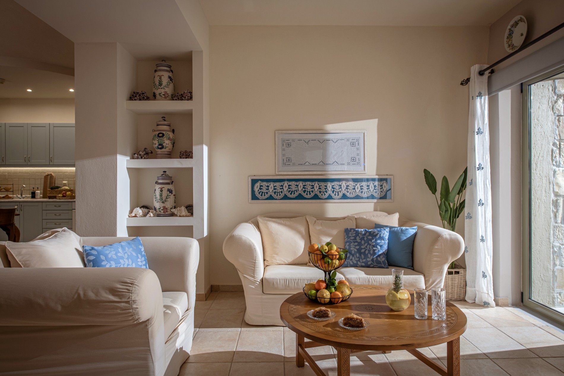 Τα πατώματα και οι τοίχοι των μπάνιων είναι επενδεδυμένα με λευκό μάρμαρο. Η επίπλωση αποτελείται από προσεκτικά συνδυασμένα σύγχρονα έπιπλα και αντίκες ώστε να δημιουργεί την οικειότητα ενός σπιτικού περιβάλλοντος. Μια συλλογή από χειροποίητα κεραμικά αριστουργήματα και πίνακες ζωγραφικούς, συμπληρώνουν την διακόσμηση.