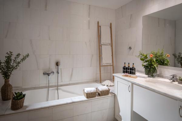 - Το μπάνιο διαθέτει: Προσόψια, λουτροπετσέτες και πετσέτες θαλάσσης, σεσουάρ, καθρέπτη make-up, σαμπουάν αφρόλουτρο, σαπούνι χεριών…