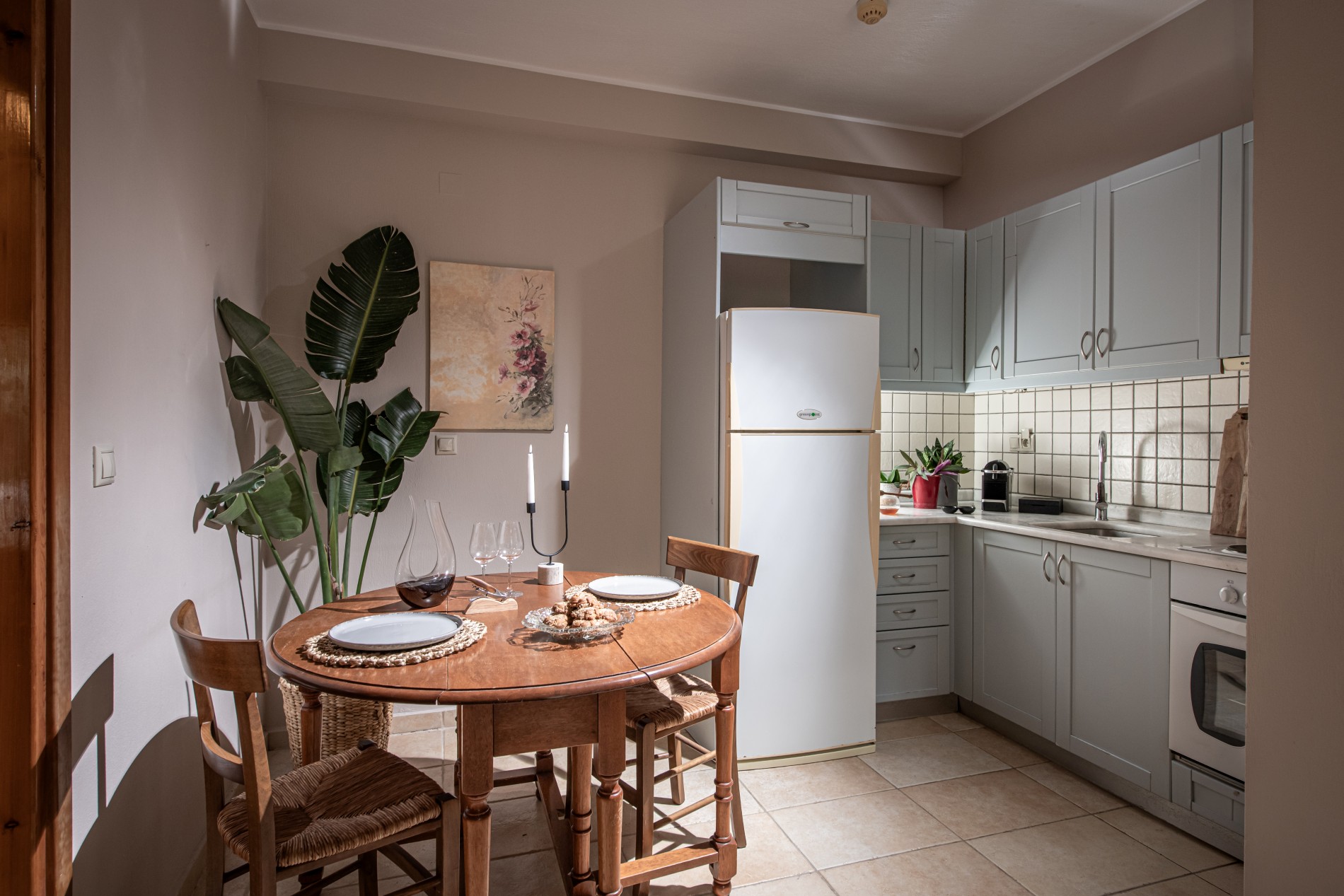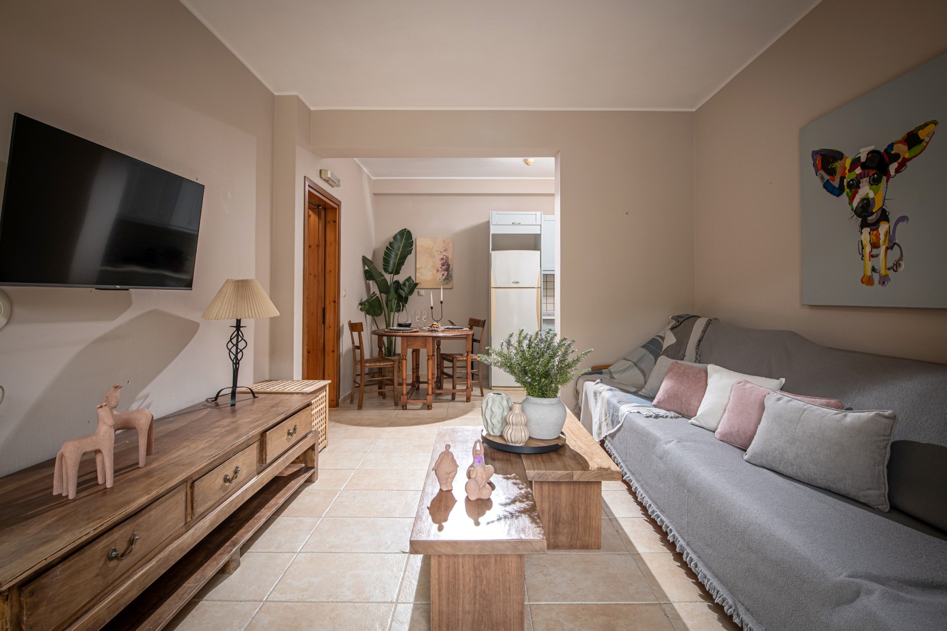 • Το καθιστικό περιλαμβάνει την κουζίνα, ένα μικρό τραπέζι φαγητού και ένα σαλόνι.
