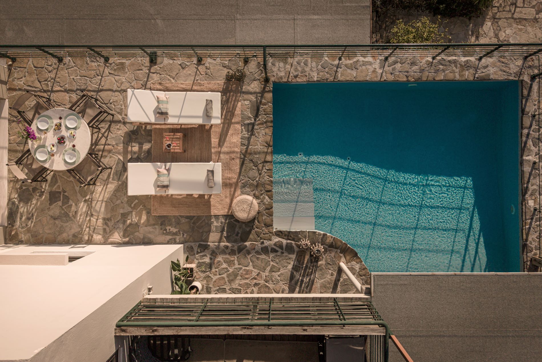 Μπροστά από τον βορινό πέτρινο τοίχο της αυλής, βρίσκεται μια στεγανή ξύλινη πέργκολα όπου υπάρχει μια κούνια για να απολαύσετε την θέα. Ένα μεγάλο μαρμάρινο τραπέζι για φαγητό σας επιτρέπει να δειπνήσετε στην ύπαιθρο και μια ομπρέλα σας βοηθά να εξασφαλίσετε την επιπλέον σκίαση που επιθυμείτε. . Η αυλή είναι αρκετά ευρύχωρη ώστε να υπάρχει χώρος για να τοποθετήσει κανείς τις ξαπλώστρες γύρω από την πισίνα. Ένα φορητό ΒΒQ είναι διαθέσιμο κατόπιν παραγγελίας.