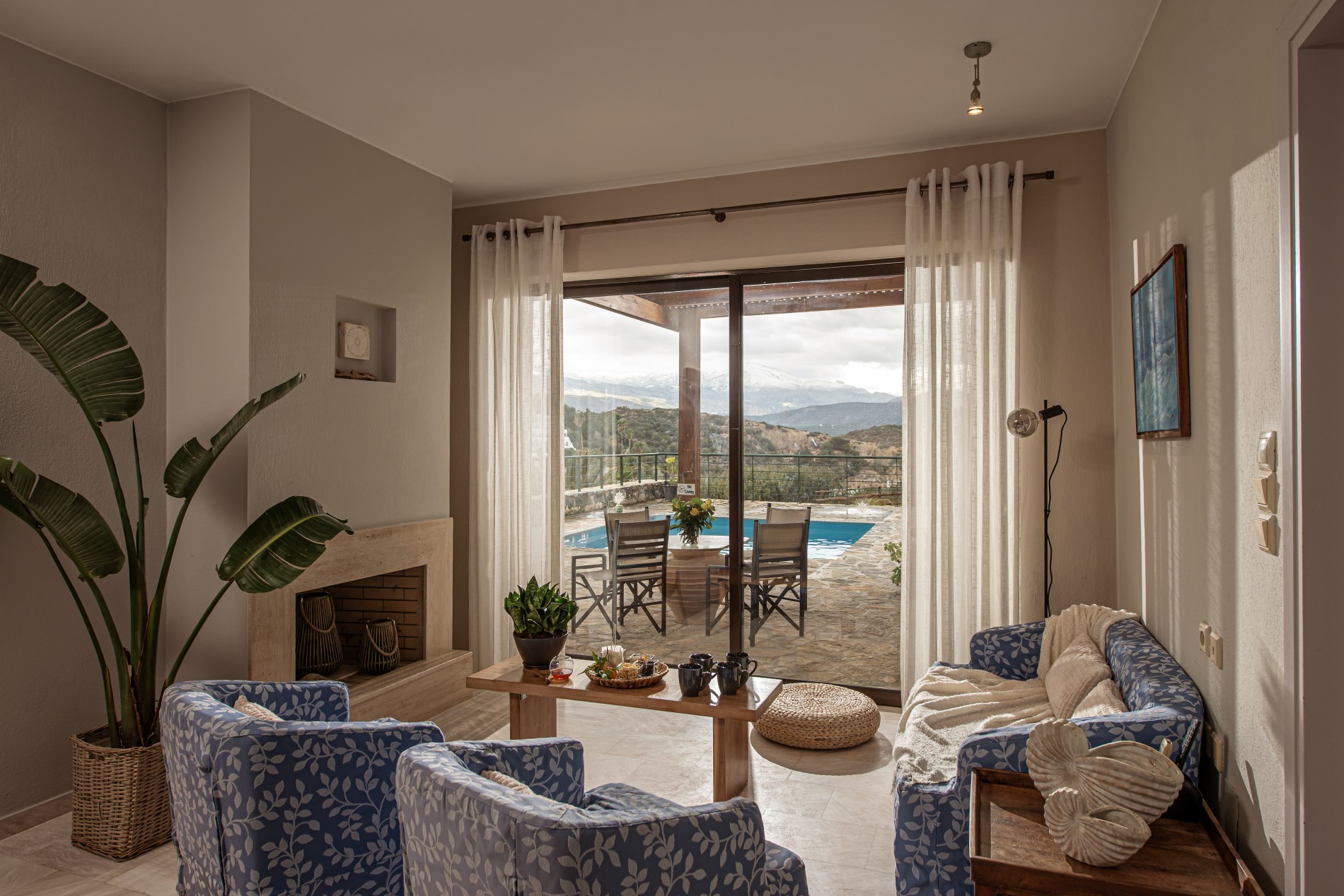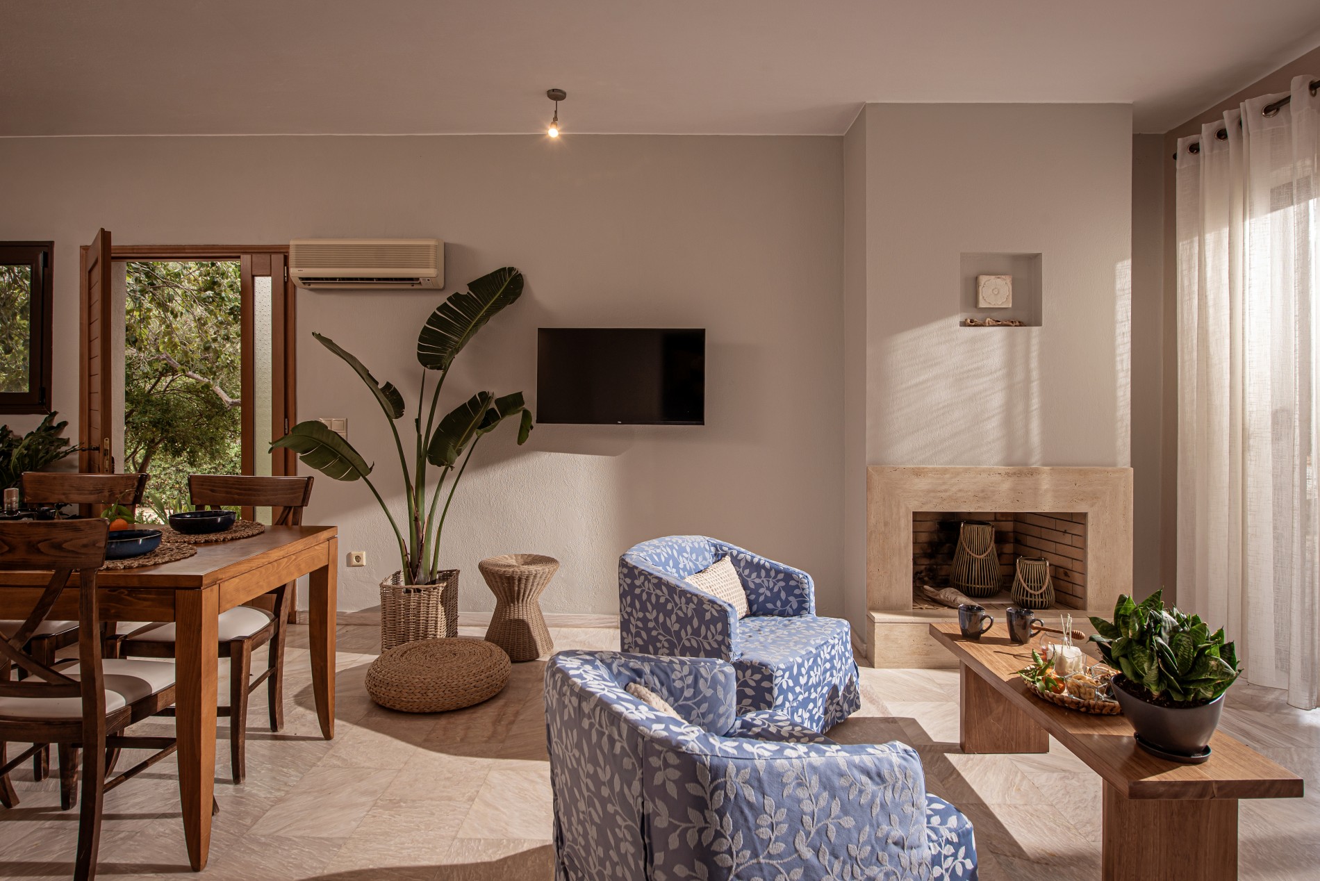 - a living area which includes a fully equipped kitchen with a dining table and a comfortable sitting area with a fireplace.