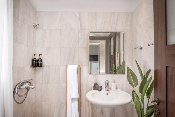 All floors and bathroom walls are tiled with a playful pink marble. Furniture equipment is an intentional mix of high standard contemporary crafts and well maintained aged pieces to create a homely atmosphere. Hand-painted drawings and pottery around the house complete the decoration.