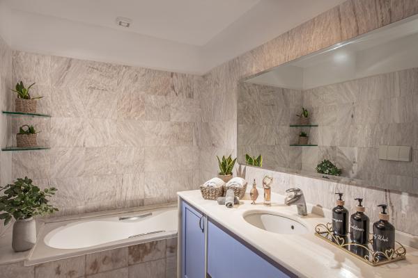 - Immersed marble-top steps secure effortless access for all.