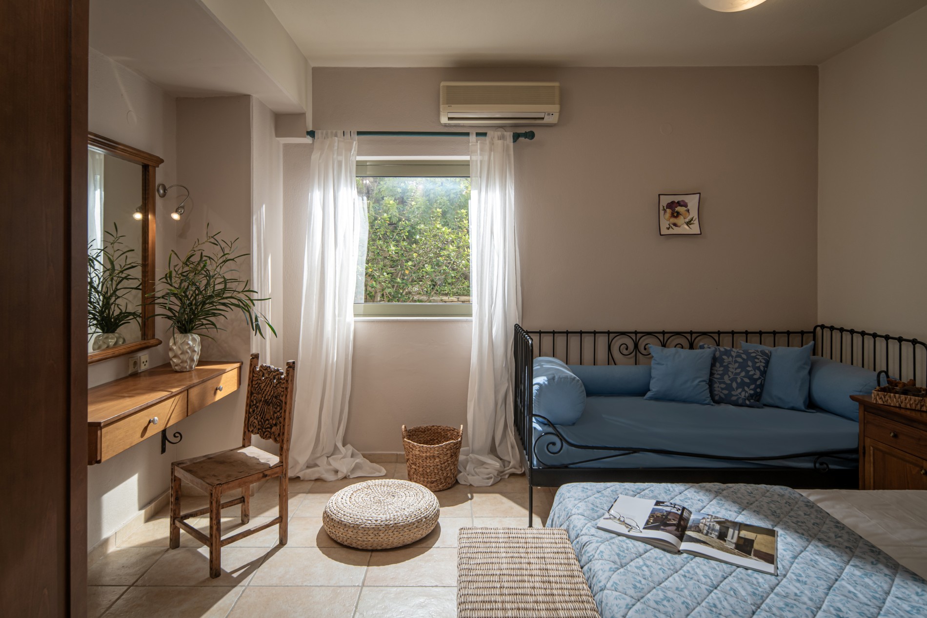 The partly flagstone, partly laid with ceramic tile patio offers views to the surrounding hills and olive groves as well as the distant mountains. You may enjoy sounds of the rattling cicadas in the midsummer during noon and gentle crickets after sunset. The sea can still be heard roaring on a quiet night.