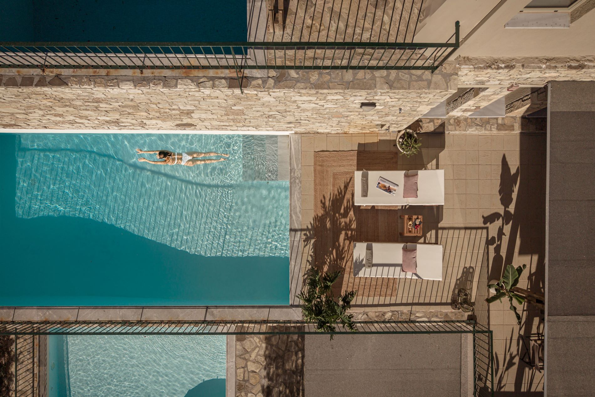 The pool occupies the front end of the terrace. Part of it is shallow, dedicated to children’s fun.