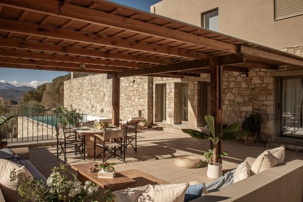 Just in front of the house and under a wooden pergola there is marble table ideal for alfresco dining. Opposite to the stone facade of the building stands a sitting area with built-in sofas. The rest of the space is for the guests to set the sunlounges and enjoy the sun. A portable BBQ is available upon demand.