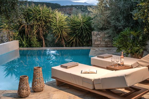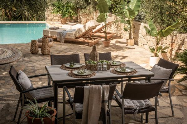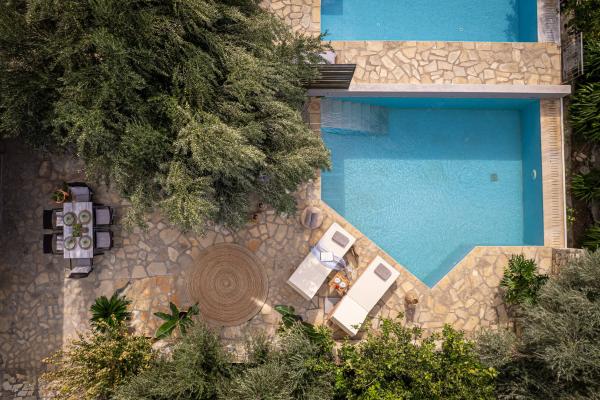 The marble top table is set under the protective shadow of an old olive tree. There is enough space in the sunnier part of the terrace, just around the pool for the guests to lay their sunlounges and enjoy the sun.