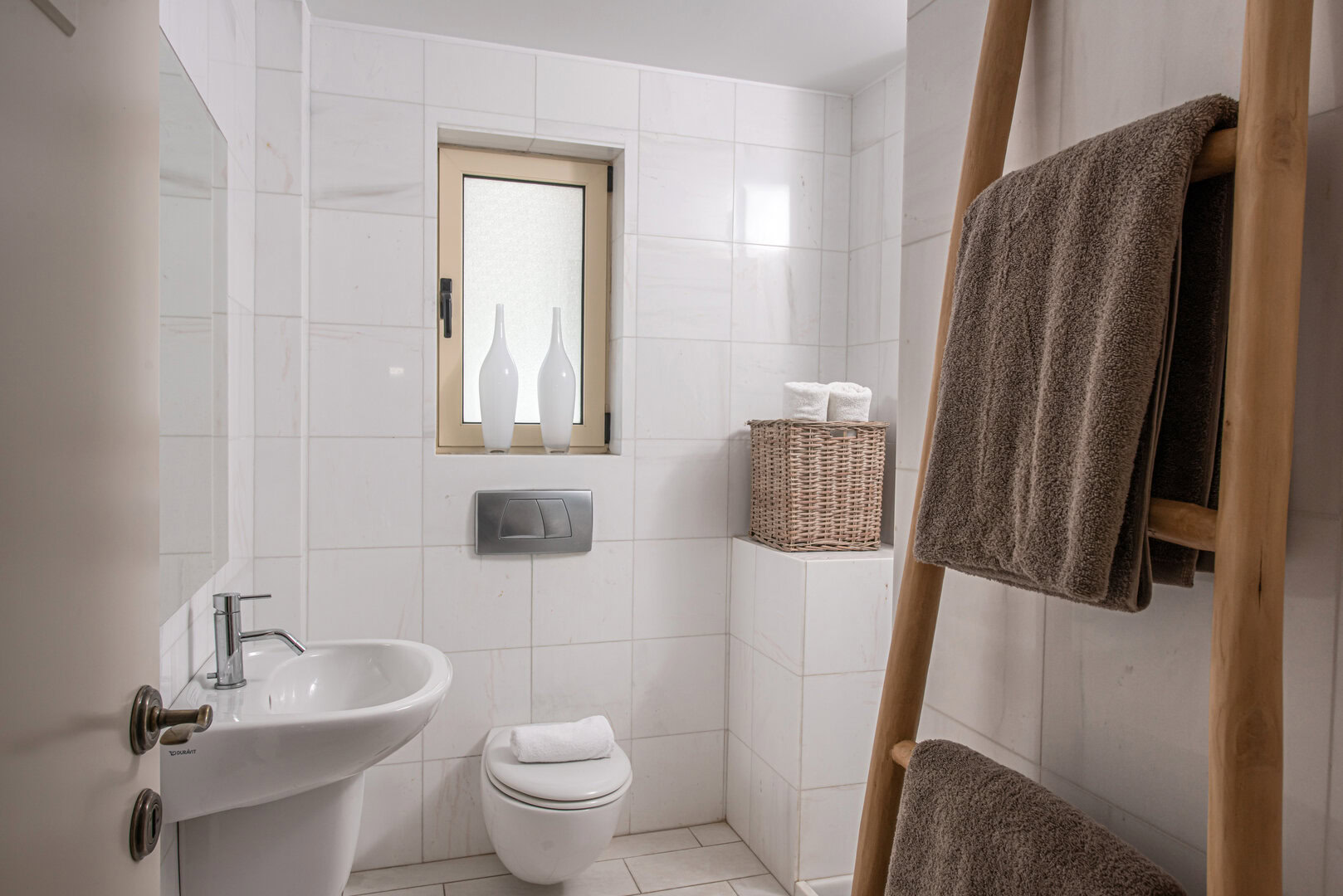 The living area has big windows allowing the light in. The blind wall is coloured in bright colours whereas the bedroom walls are coated in more earthly hues. All bathrooms walls are tiled with white marble. There are prominent folk art elements in the decoration of the house.